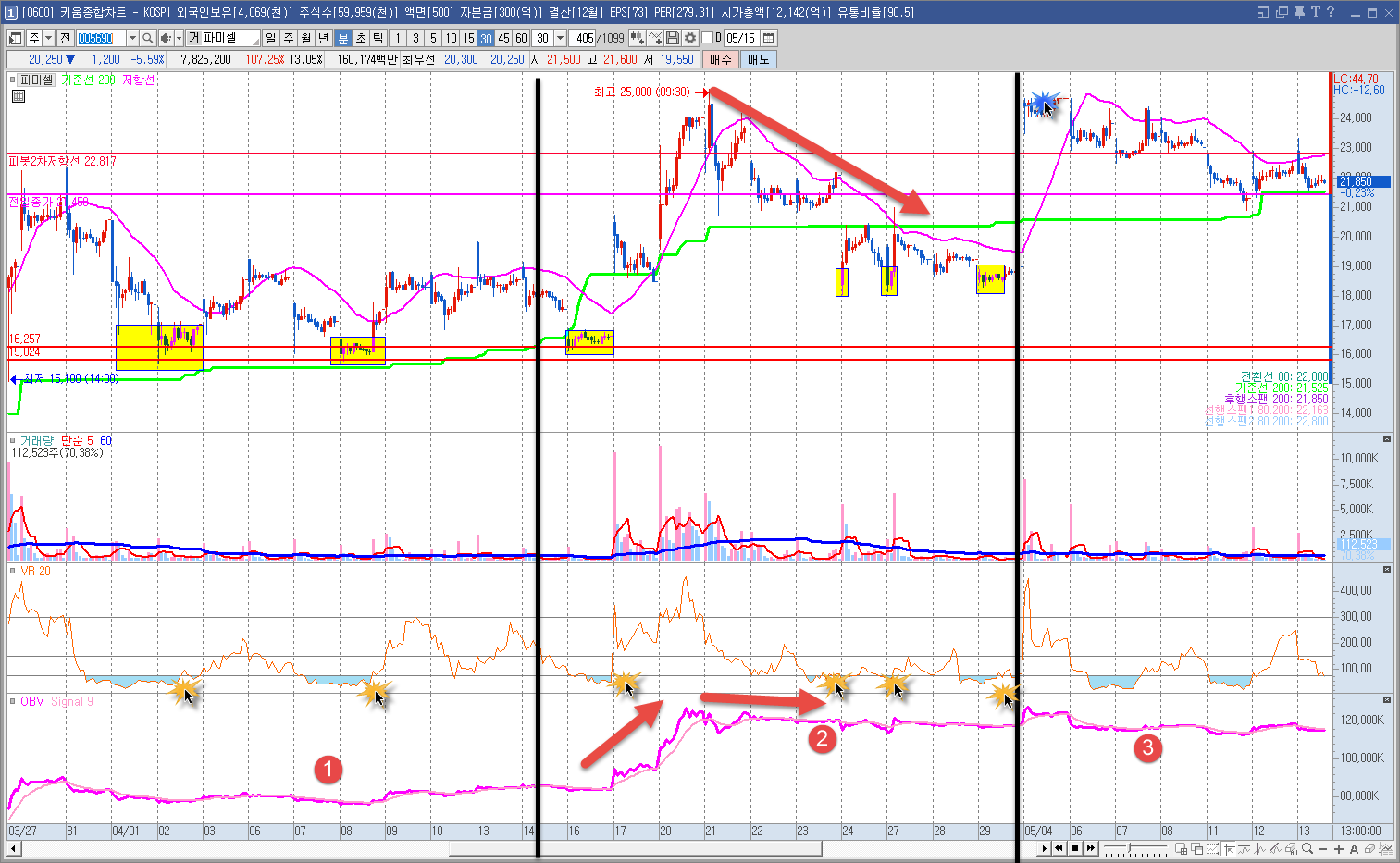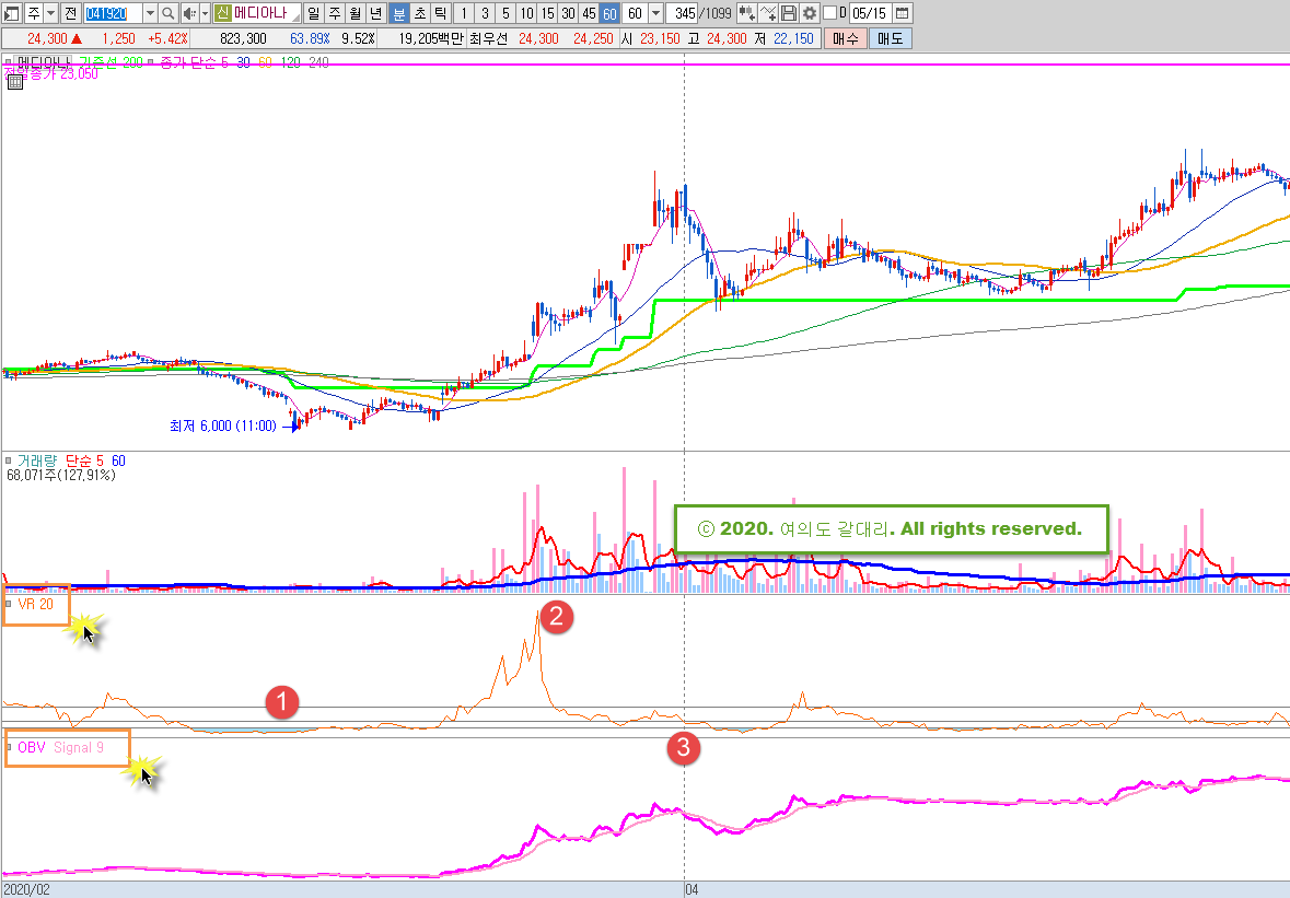 상기 차트에서 VR 보조지표와 OBV 보조지표를 표기하였니다.