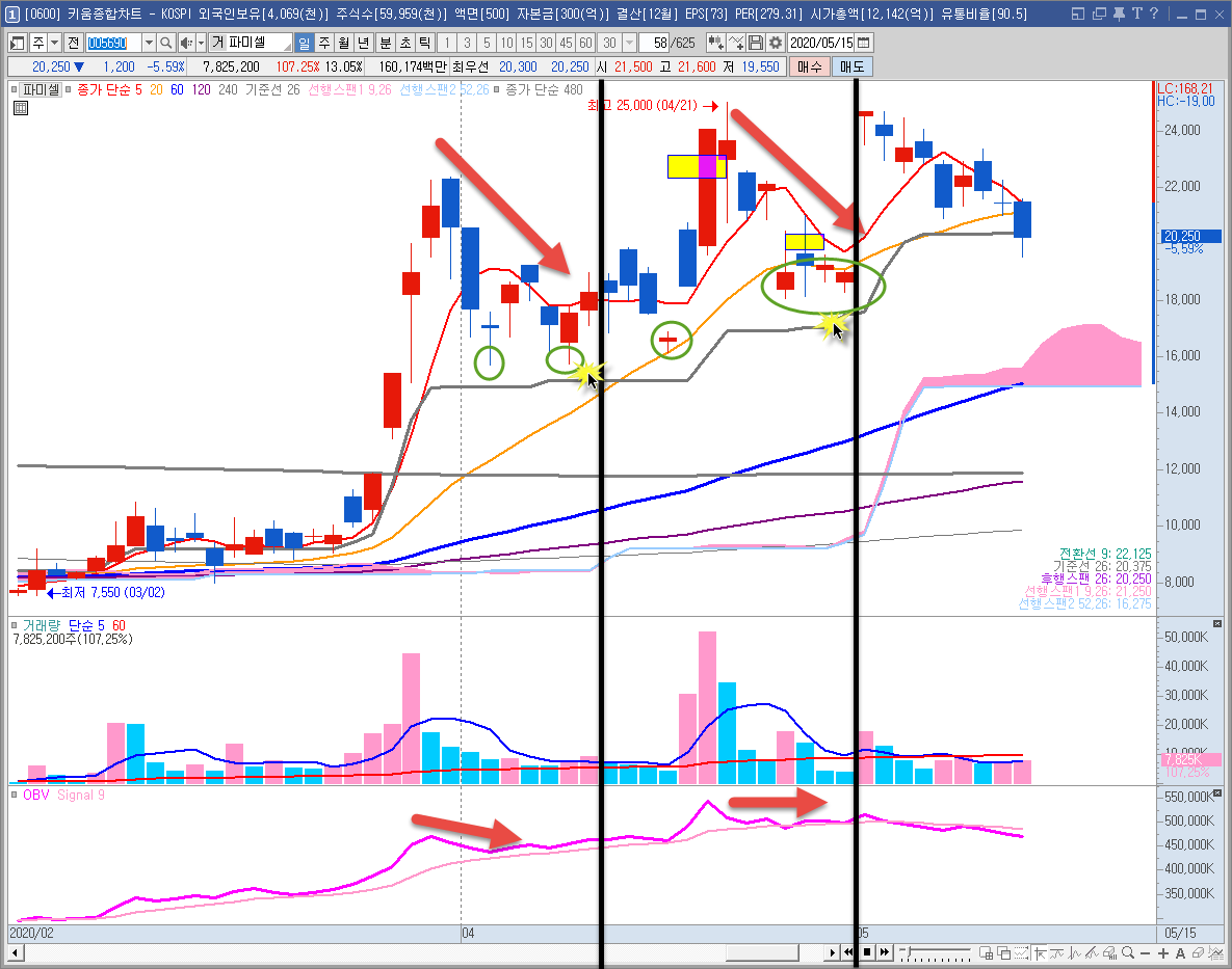 이처럼 주가가 상승하는 상황에서 거래량이 급감하였지만, OBV는 크게 하락하지 않고 OBV가 살아있는 종목에서 선별을 하는 것이 수월합니다.
