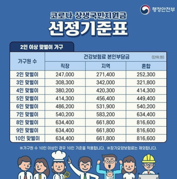 1인 가구 연 소득 5,000만 원, 맞벌이 가구는 별도 기준을 적용하고 있는데 올려드린 코로나 상생 국민 지원금 선정 기준표를 확인해 보시면 좋을 것 같습니다.