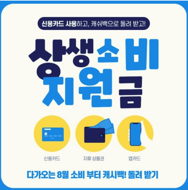 상생 소비 지원금은 월 최대 10만 원 한도로 올해 2021년 2분기 월평균 카드 사용액 대비 해당 월의 카드 사용액이 3% 이상 증가했을 경우 초과분의 10%에 해당하는 금액을 캐시백 형태로 지급하는 방식을 의미하는데 신청 및 지급 시기의 경우 추후 확정하여 공지할 예정이라고 합니다. 법인 카드를 제외한 모든 신용 카드와 체크 카드는 가능하지만, 백화점, 대형 마트 및 온라인 쇼핑몰 등 일부는 제한할 예정이라고 합니다.