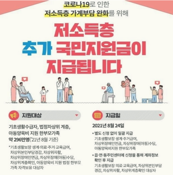 저소득층 추가 국민 지원금은 별도의 신청은 없으며, 거주지 기준 읍, 면, 동 주민 센턴에 문의해 보시면 됩니다.
