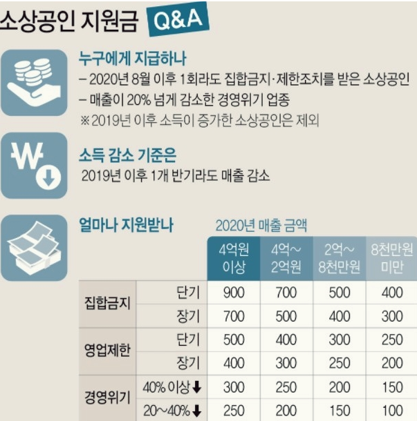 영업 제한은 2020년 8월 16일 ~ 2021년 7월 6일 기간 중 중대본, 지자체 방역 조치로 영업 제한을 이행하고 매출이 감소한 소기업 및 소상공인을 대상으로 최대 900만 원까지 지급이 될 예정이라고 합니다.